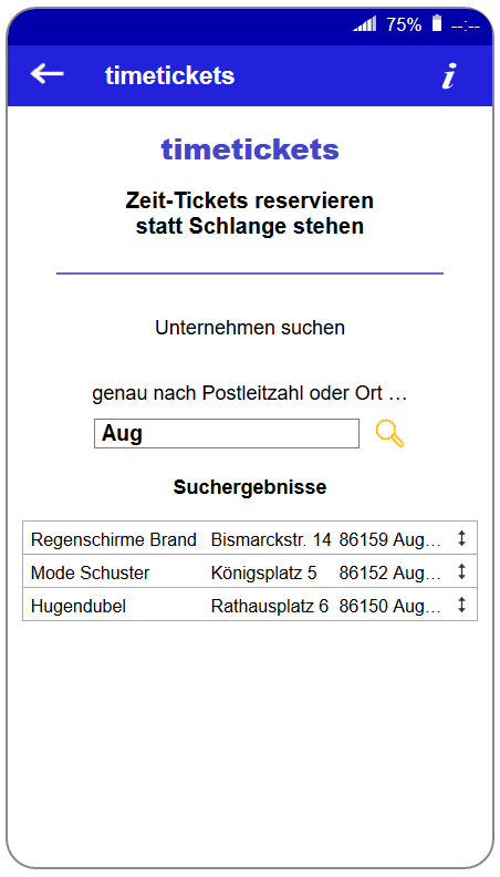 Suchen Sie im Google-Play-Store nach timetickets und installieren Sie die Android-App oder gehen Sie auf dem iPhone zu www.timetickets.de und installieren Sie sich dort die Web-App.