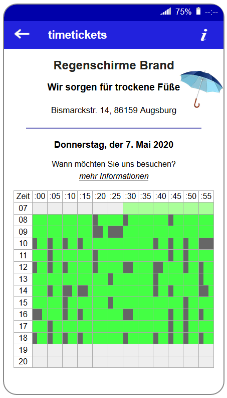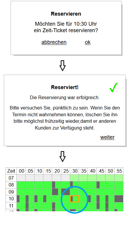Die Tickets werden maximal im 5-Minuten-Takt angeboten, um die spätere Kontrolle zu erleichtern und um Pünktlichkeits-Stress zu vermeiden.