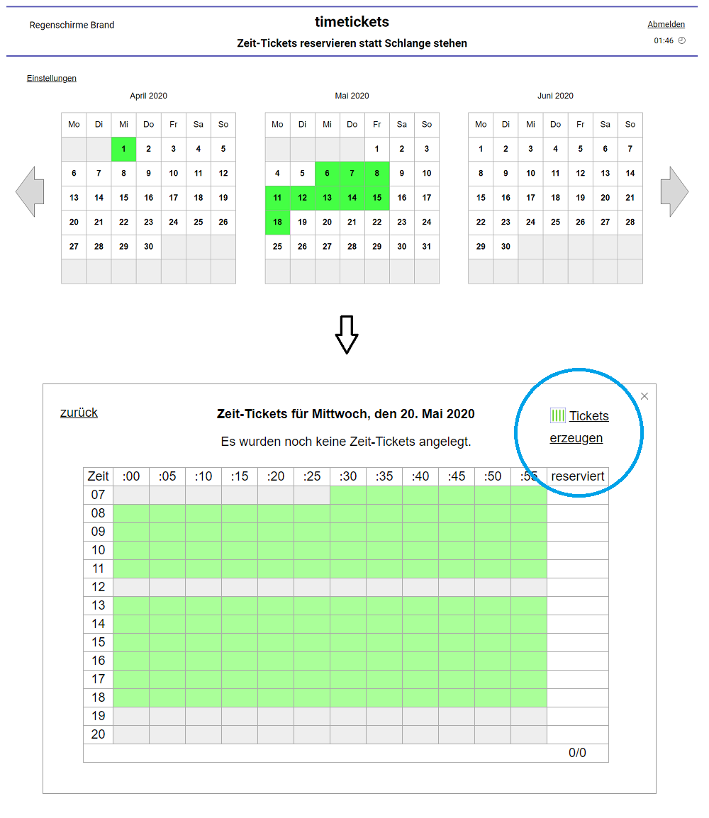 Über den Link oben rechts lassen sich die Tickets erzeugen.